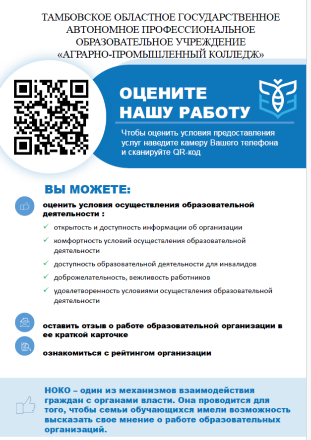 В 2022 году общественным советом при управлении образования и науки области по проведению независимой оценки качества образования (далее – управление образования) была проведена независимая оценка качества условий осуществления образовательной деятельности в отношении государственных и муниципальных образовательных организаций области На официальном сайте bus.gov.ru размещены количественные результаты по общим критериям в отношении каждой образовательной организации и отдельно в отношении нашего колледжа.